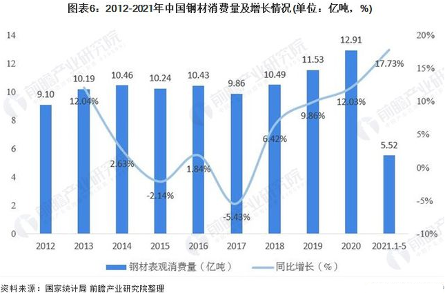 2012-2020年,中国钢材表观消费量总体呈现上升态势,但波动较大,其中2020年中国钢铁表观消费量为12.91亿吨,同比增长12.03%,增速较上年有大幅提升。2021年1-5月中国钢材表观消费量为5.52亿吨,同比增长17.73%。