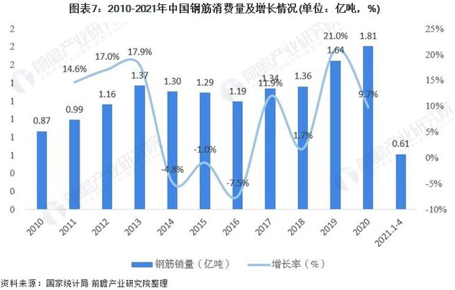 得益于基建、房地产等下游行业的稳定运行,2020年钢筋市场需求较高,销量达18051万吨,2021年1-4月,钢筋消费量为6098万吨。