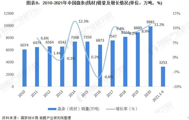 国家统计局数据显示,2017年以来,我国盘条(线材)销量呈逐年增长态势,2020年销量达9883.05万吨,2021年1-4月,销量为3253.23万吨。