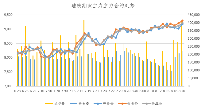 原料兰炭价格高位持稳,期货盘面连续攀升,本周国内硅铁市场继续稳健运行,现货报价坚挺,业内信心较好,看涨情绪浓烈。8月钢招结束,价格多环比上涨500元/吨左右,以当前态势预测,9月钢招价大概率将继续增长。