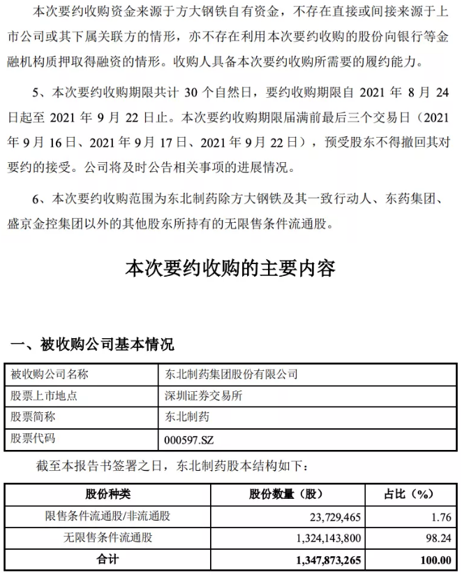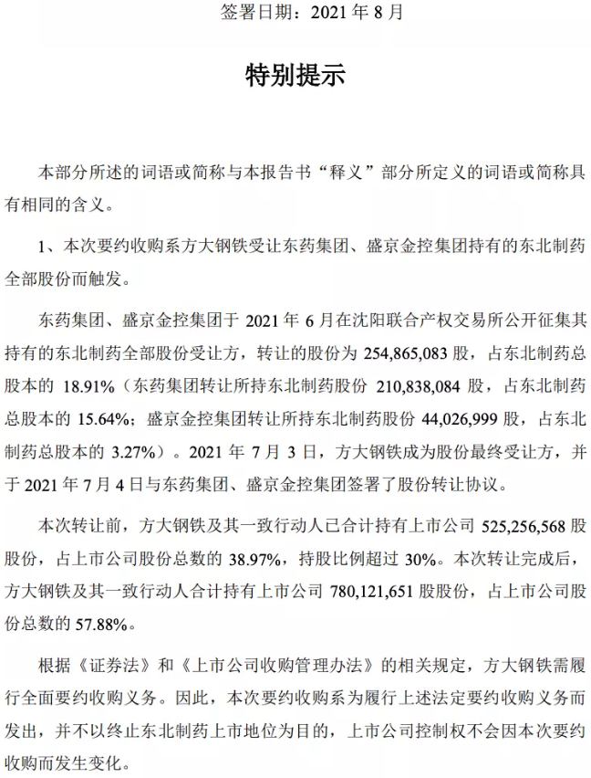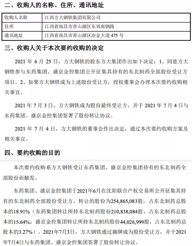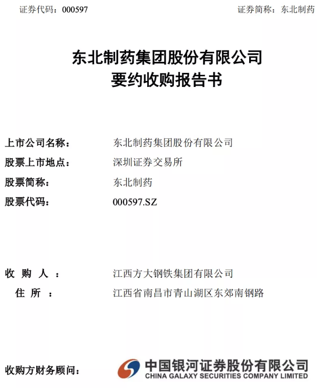 8月22日晚间,东北制药公告称,方大钢铁受让东药集团、盛京金控集团持有的东北制药全部股份而触发全面要约收购。