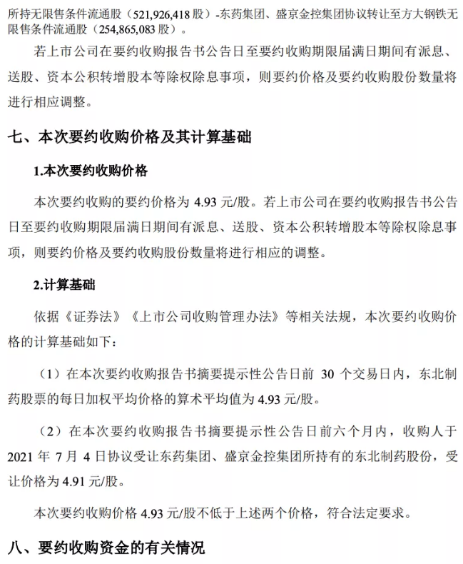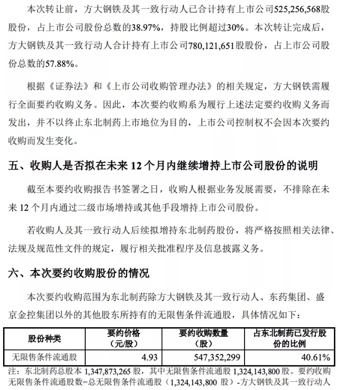 本次转让完成后,方大钢铁及其一致行动人合计持有东北制药57.88%股份。方大钢铁向东北制药除方大钢铁及其一致行动人、东药集团、盛京金控集团以外的其他股东发出全面要约收购。