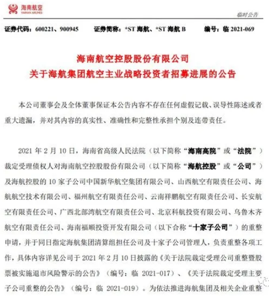 9月12日晚间,*ST海航(600221)披露战略投资者招募进展公告。目前,管理人已经确定海航集团航空主业战略投资者为辽宁方大集团实业有限公司(以下简称“方大集团”),若投资完成,方大集团可能成为公司控股股东。