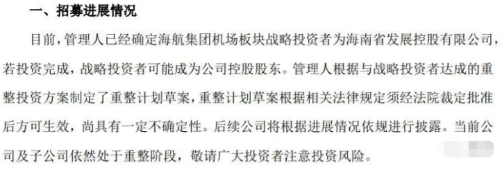 据披露,目前,管理人已经确定海航集团机场板块战略投资者为海南省发展控股有限公司,若投资完成,战略投资者可能成为公司控股股东。公开信息显示,海南省国资委持有海南省发展控股有限公司90%股权。