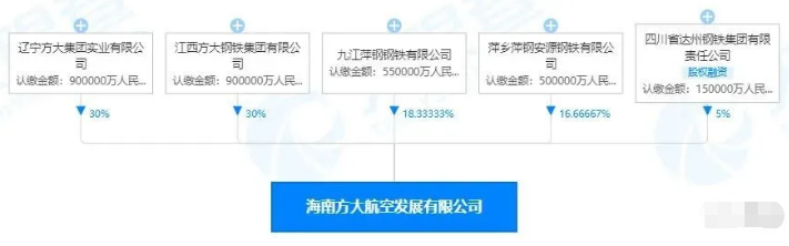 公开信息显示,方大航空共有五名股东,其中辽宁方大集团实业有限公司与江西方大钢铁集团有限公司各持股30%,九江萍钢钢铁有限公司持股18.33%,萍乡萍钢安源钢铁有限公司持股16.67%,四川省达州钢铁集团有限责任公司持股5%。