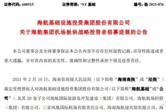 同日,*ST基础披露了海航集团机场板块战略投资者的最新进展。