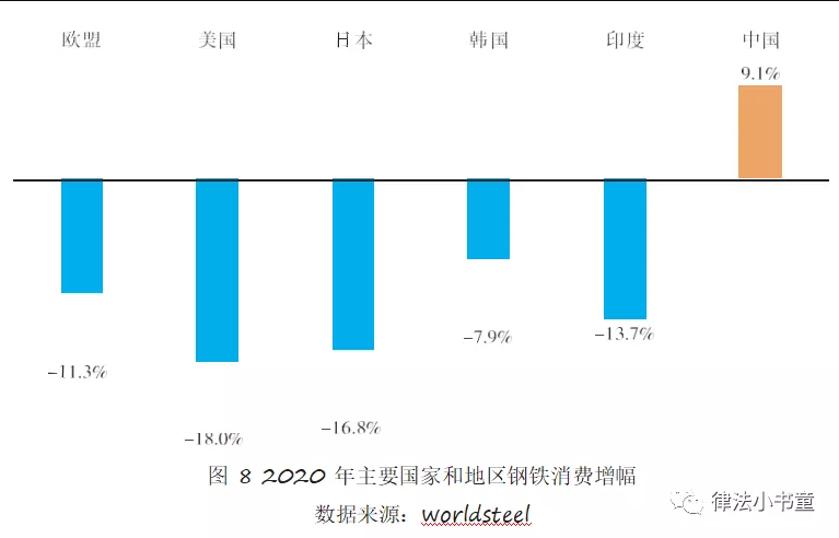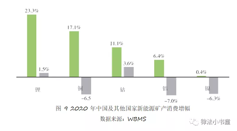 2020 年,主要经济体钢铁消费量出现大幅下降,分别为美国(-18%)、欧盟(-11.3%)、日本(-16.8%)、韩国(-7.9%)、印度(-13.7%),中国消费逆势增长 9.1%。主要经济体铜、铝、镍等有色金属消费也出现大幅下降,锂、钴消费微增,中国铜、铝以及钴、锂、镍等新能源矿产消费总体保持较快增长,2020 年同比分别增长 17.1%、6.4%、11.1%、23.3%、0.4%。