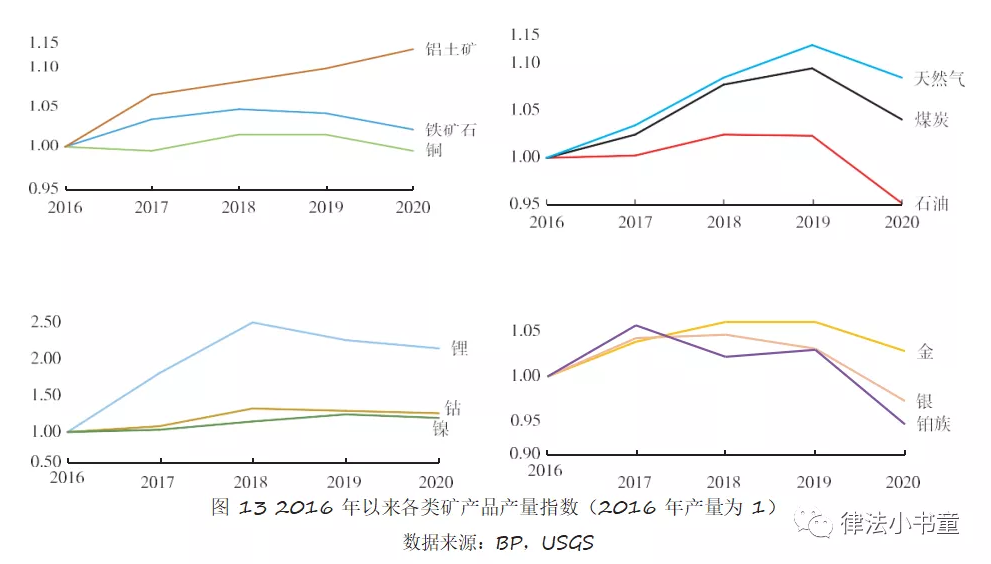 与 2019 年相比,2020 年澳大利亚煤炭、铁矿石、铜、金等矿产品产量下降,俄罗斯煤炭、石油、天然气、金、铂族等矿产品产量下降,巴西铁矿石、金等矿产品产量下降,秘鲁铜、金、铅、锌产量下降,智利铜产量下降,南非铁、锰、金、铂族等矿产品产量下降。