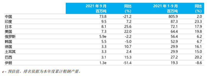 2021年1-9月粗钢产量累计前十位国家