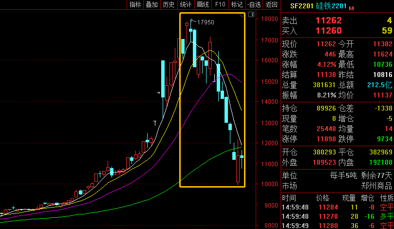 国庆节后,各主产区限电限产形势较节前有所缓解但依然严峻,电价上涨已成定局,各地涨幅略有差别。10月中旬起,期货盘面几乎断崖式下跌,震荡明显,几度跌停;现货市场跌幅较为平缓,但报价较高峰时已下调3000元/吨以上。电力供应紧张、电价上涨,加之原料兰炭价格居高不下,且部分地区存在运输受阻问题,不少硅铁厂纷纷表示生产成本较高,且生产及交货存在一定困难,10月28日上午开始,宁夏中卫地区多家硅铁厂发布矿热炉停电申请,下午盘面立时止跌反弹。10月硅铁期货2201主力合约开盘价17000,最高价17950,最低价9930,收盘价11262,结算价11138,成交量5710500,持仓量89926,涨幅-30.24%。