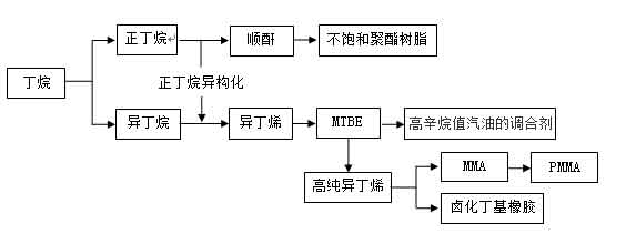 利用进口碳四资源,发展丁烷下游深加工。正丁烷下游规划顺酐和正丁烷异构化项目,顺酐向下游延伸发展不饱和聚酯;异丁烷下游规划异丁烷脱氢,MTBE及MMA、卤化丁基橡胶等系列项目。