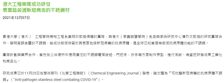 12月7日,香港大学发布公告称香港大学工程学院机械工程系黄明欣教授领导的团队,与港大(李嘉诚医学院)免疫与感染研究中心潘烈文教授的研究团队合作,发明高铜含量的不锈钢,能成功杀灭存留于其表面包括新冠病毒的抗病原体,是全球已知首个有杀灭抗病原体功能的不锈钢。