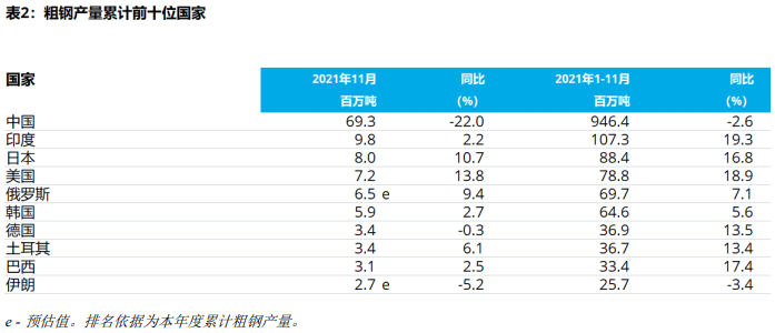 世界钢铁协会发布数据,2021年11月全球64个纳入世界钢铁协会统计国家的粗钢产量为1.433亿吨,同比下降9.9%。
