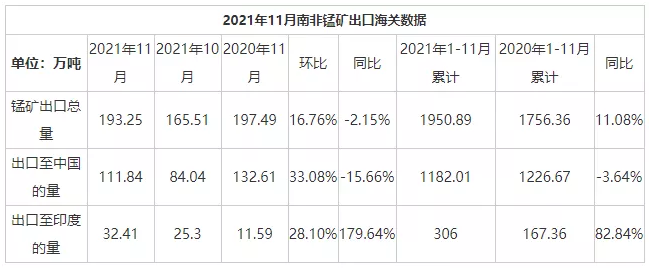 2021年1-11月南非锰矿出口量累计约1950.89万吨,同比增长11.08%;其中累计出口至中国1182.01万吨,同比下降3.64%,累计出口至印度306万吨,同比增长82.84%。