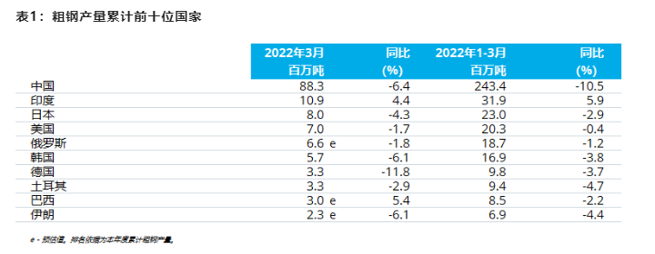 2022年3月粗钢产量累计前十位的国家