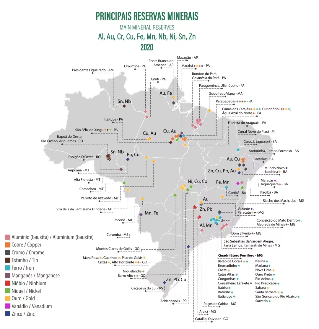 中国铁合金网:目前,有 37 种矿产金属在国家矿业局注册并获得研究和采矿权。2020年,金属矿产占巴西矿产总产值的80%左右。在金属矿产物质中,有11种金属脱颖而出,占该类产值的99.7%,即:铝、铜、铬、锡、铁、锰、铌、镍、金、钒和锌。这 11 种物质的产值总计 1935 亿雷亚尔,其中铁矿份额表现尤为突出,其生产主要集中在帕拉州和米纳斯吉拉斯州。因此,考虑到这 11 种金属物质在巴西矿产生产中的重要性,我们提供反映其在 2020 年全年表现的统计数据及巴西矿产资源分布,如需索要具体明细,请联系中铁合金网。