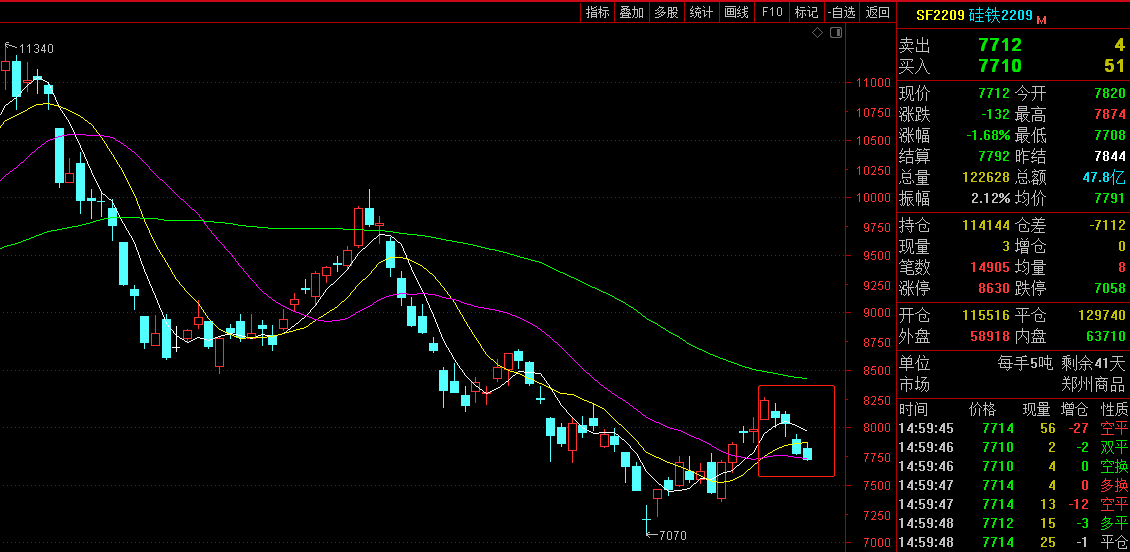 本周硅铁期货2209主力合约开盘价8,072,最高价8,272,最低价7,708,收盘价7,712,结算价7,792,成交量696,692,持仓量114,144,跌幅3.31%。
