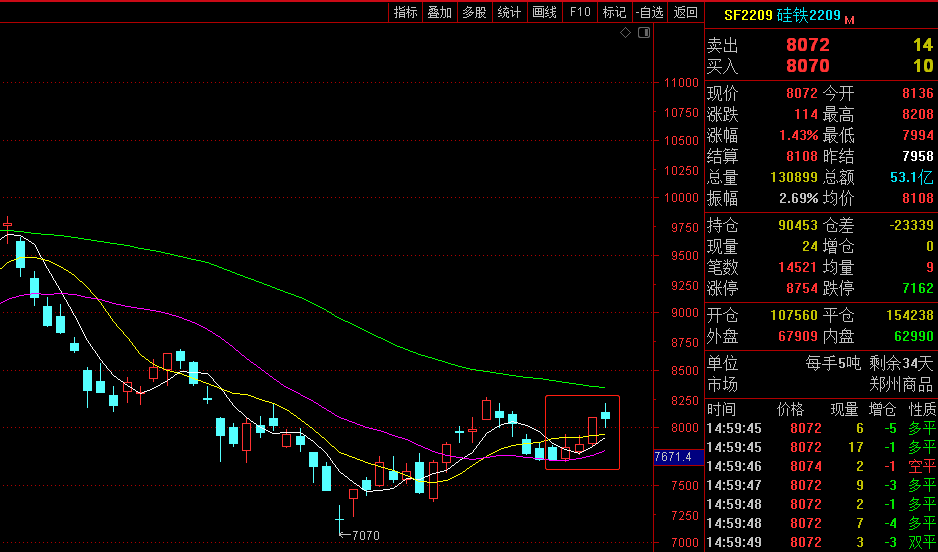 本周硅铁期货2209主力合约开盘价7,828,最高价8,208,最低价7,700,收盘价8,072,结算价8,108,成交量678,552,持仓量90,453,涨幅3.59%。
