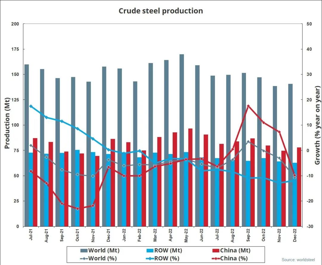 2022年12月全球64个纳入世界钢铁协会统计国家的粗钢产量为1.407亿吨,同比下降10.8%。