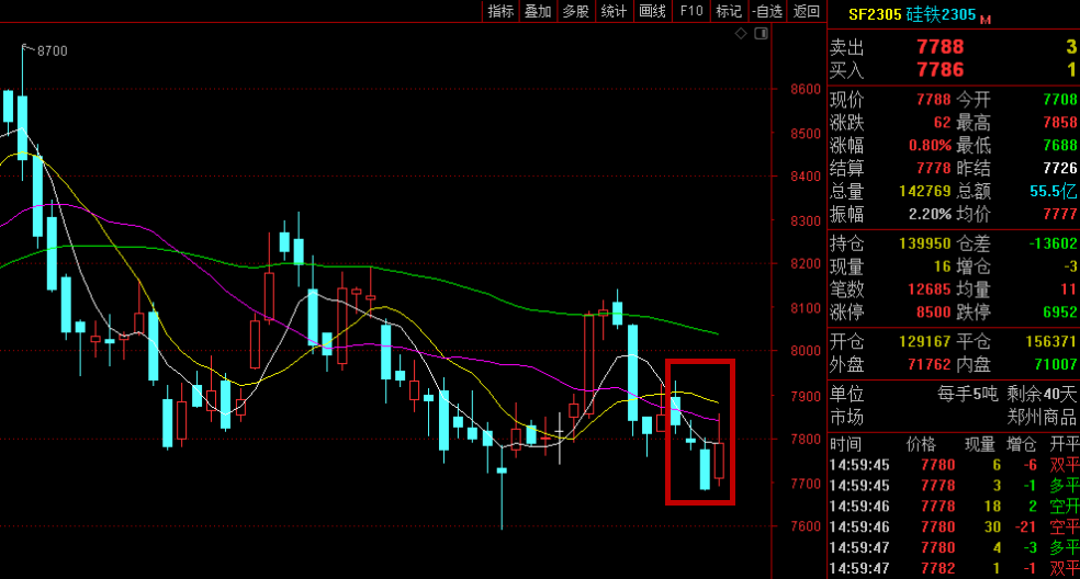 本周2305主力合约开盘价7,894,最高价7,932,最低价7,680,收盘价7,788,结算价7,778,成交量484,685,持仓量139,950,跌幅1.12%。