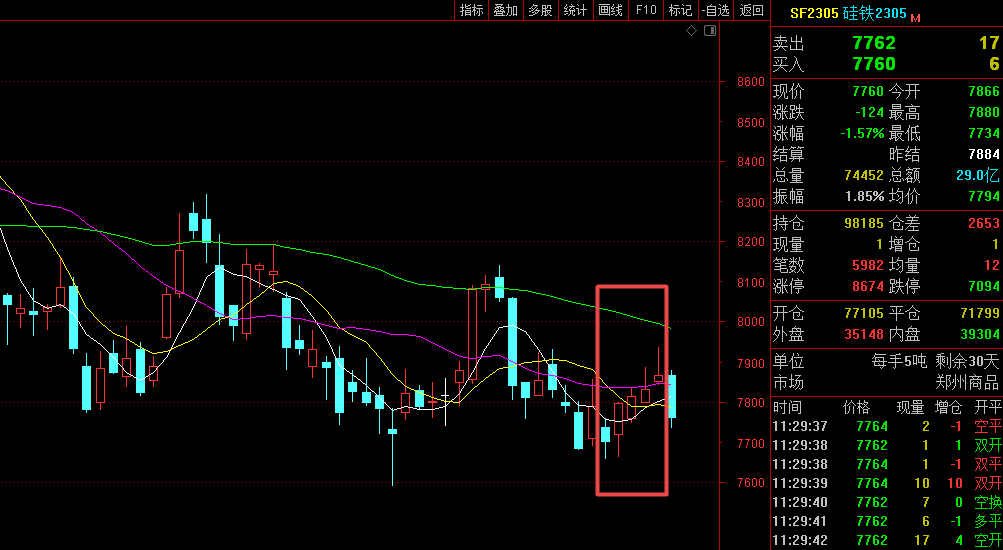 4月10日-14日一周2305主力合约开盘价7,736,最高价7,938,最低价7,656,收盘价7,866,结算价7,884,成交量541,146,持仓量95,532,涨幅1.13%。