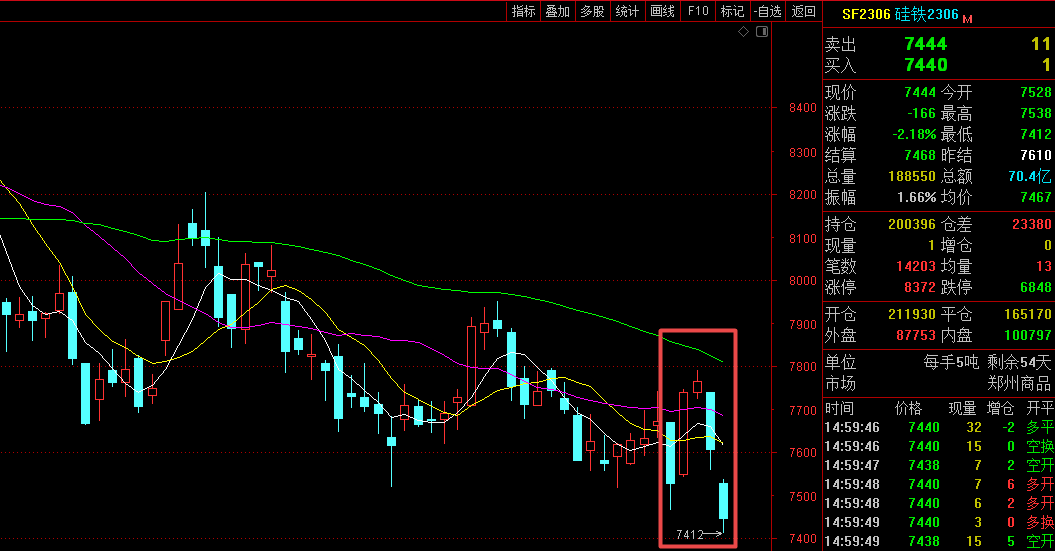 本周2306主力合约开盘价7,670,最高价7,794,最低价7,412,收盘价7,444,结算价7,468,成交量818,560,持仓量200,396,降幅3.07%。