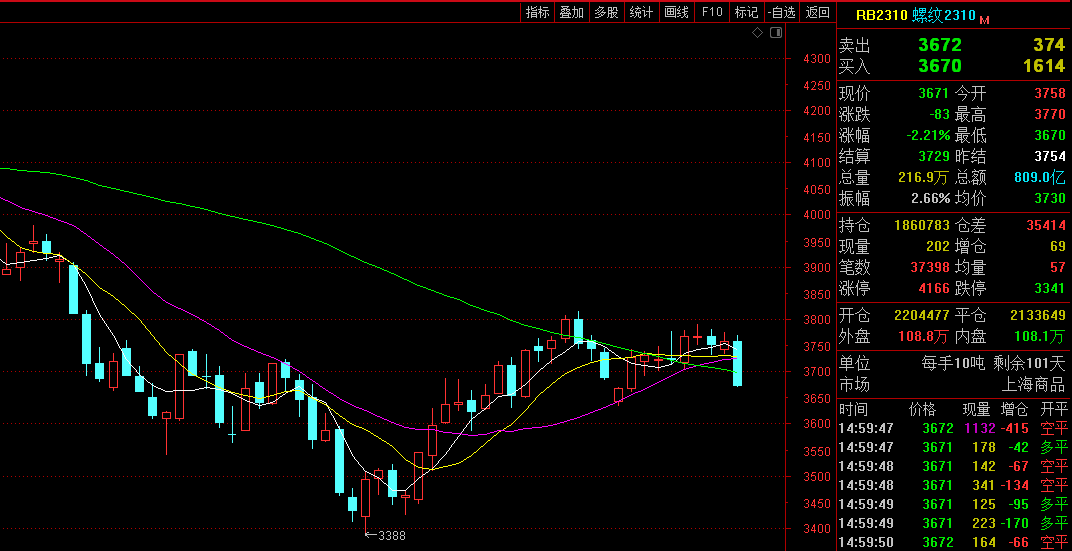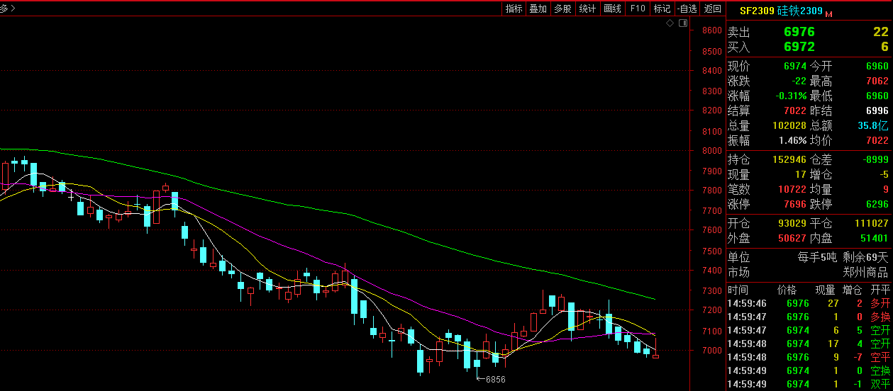本周2309主力合约开盘价7,116,最高价7,116,最低价6,960,收盘价6,974,结算价7,022,成交量479,174,持仓量152,946,跌幅2.60%。