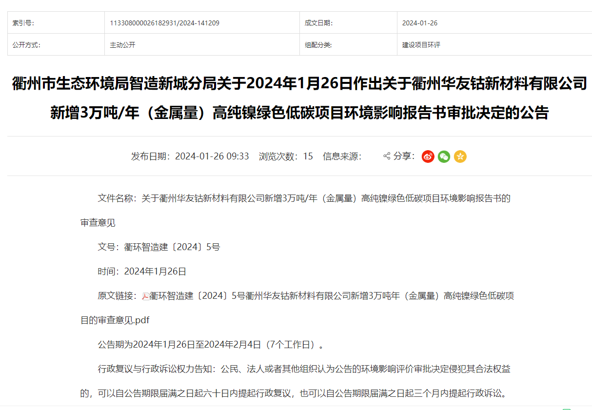 2024年1月26日,衢州市生态环境局智造新城分局就衢州华友钴新材料有限公司新增3万吨/年(金属量)高纯镍绿色低碳项目环境影响报告书作出审批决定并对外进行公告,公告期:2024年1月26日至2024年2月4日(7个工作日)。