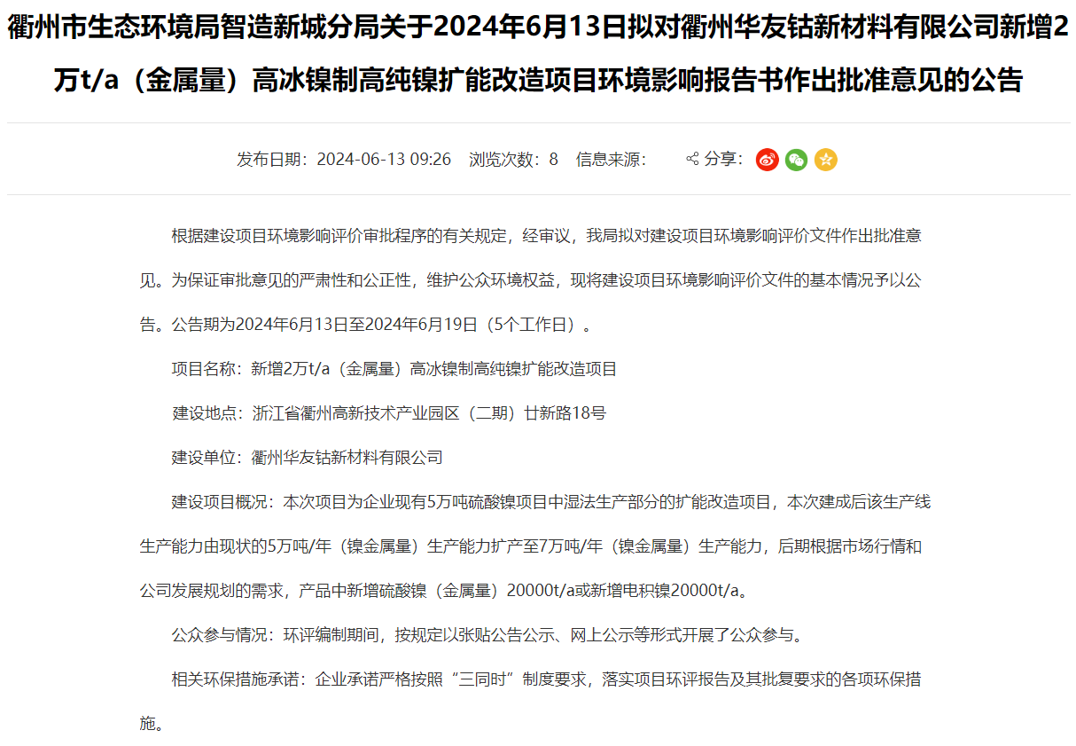 2024年6月13日,衢州市生态环境局智造新城分局拟对衢州华友钴新材料有限公司新增2万t/a(金属量)高冰镍制高纯镍扩能改造项目环境影响报告书作出审批意见并对外进行公告,公告期为2024年6月13日至2024年6月19日(5个工作日)。