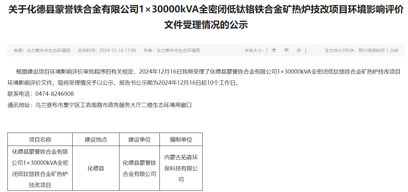 2024年12月16日,乌兰察布市生态环境局受理化德县蒙誉铁合金有限公司1×30000kVA全密闭低钛铬铁合金矿热炉技改项目环境影响评价文件并对外进行公示,公示期为2024年12月16日起10个工作日。