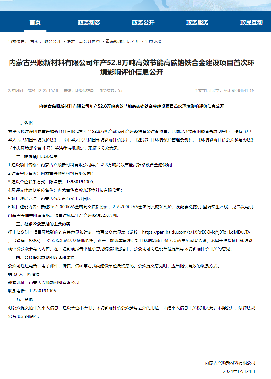 内蒙古兴顺新材料有限公司年产52.8万吨高效节能高碳铬铁合金建设项目首次环评信息公开