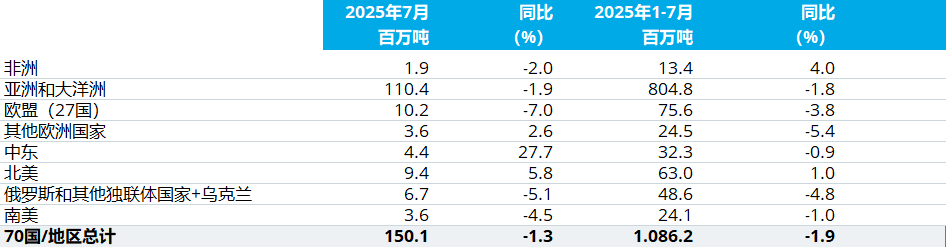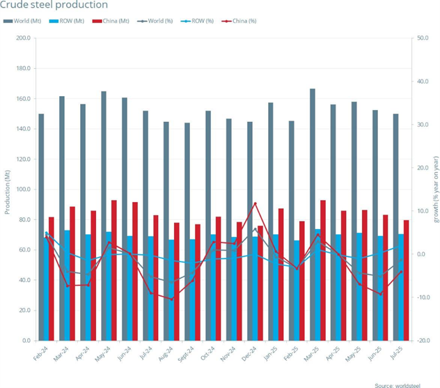 中国铁合金网:2025年7月全球70个纳入世界钢铁协会统计国家/地区的粗钢产量为1.501亿吨,同比下降1.3%。