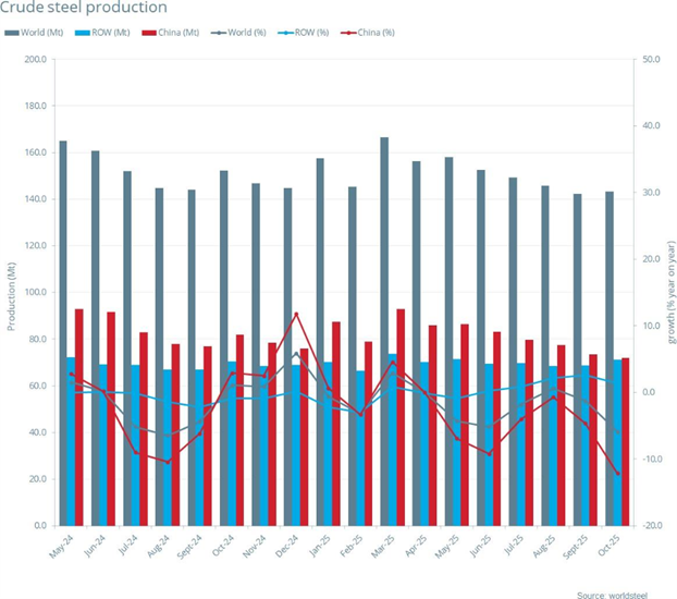 中国铁合金网:2025年10月全球70个纳入世界钢铁协会统计国家/地区的粗钢产量为1.433亿吨,同比下降5.9%。