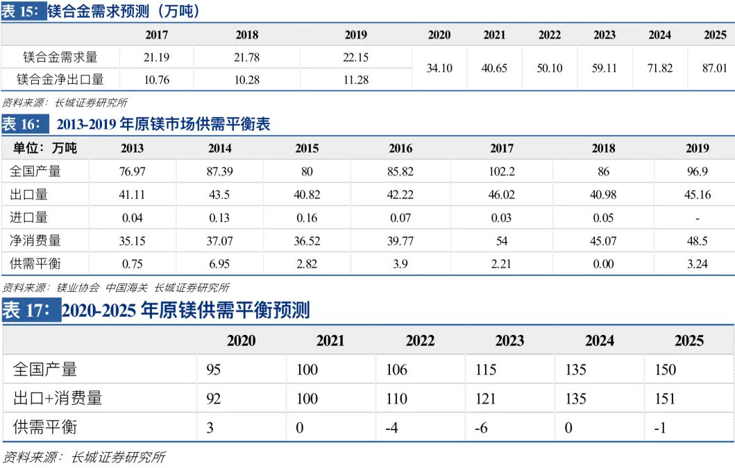 假设镁合金轮毂、电池支架、电池包外壳按照我们此前的判断迎来爆发,镁合金建筑模板以每年2%的速度实现对铝合金模板的替代,除此以外其他需求以2%增速增长,到2025年镁合金需求量将达到72.27万吨。