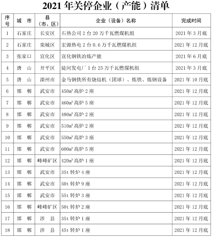 河北省2021年关停钢企(产能)清单出炉:关停20座高炉20座转炉 还涉宣钢、金马钢铁等