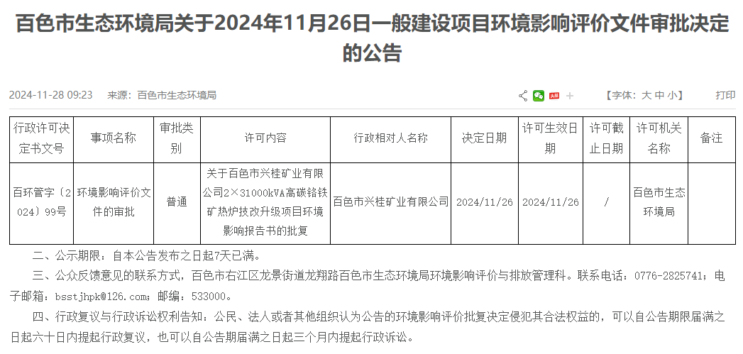 广西百色市兴桂矿业有限公司2×31000kVA高碳铬铁矿热炉技改升级项目环评获审批决定