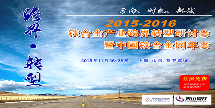 各相关单位: 由中国铁合金网(FERRO-ALLOYS.COM)主办,山东泰山钢铁集团有限公司协办的“2015铁合金产业跨界转型研讨会暨中国铁合金网年会” 将于2015年11月26-28日在莱芜宾馆召开。 |