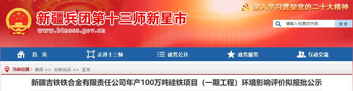 新疆吉铁铁合金有限责任公司年产100万吨硅铁项目(一期工程)环境影响评价拟报批公示