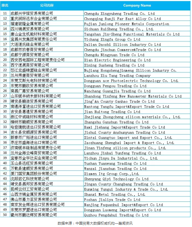 全球最大的贸易统计数据库—GTA 2015年终统计结果显示,2015-2016全国出口硅(商品编码 28046900)产品的出口商共有675家,瀚闻资讯优质出口商名录将显示排名11-50名出口商。 |