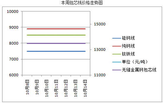 中国铁合金网讯:国庆周期间,包芯线市场并无较大动荡。硅钙线、钙铁线、碳线、钛铁线等包芯线都仍旧保持低位稳定运行。原料方面,带钢没有持续涨价。相反,金属钙在这一周走出了不俗的涨势,尤其粗钙价格竟高达15000元/吨(河南地区含税价),相比8月上涨700元/吨。金属钙包芯线... |