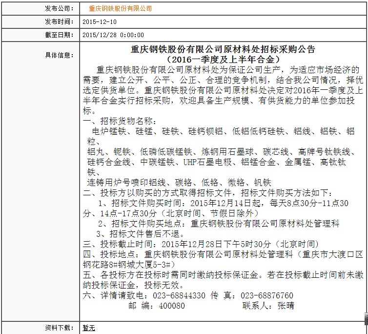 山东钢铁集团国际贸易有限公司现组织对山东钢铁集团有限公司(山钢股份济南分公司、山钢股份莱芜分公司、淄博张钢)2015年12月份生产所需的锰硅合金、硅铁、高锰、中锰、高铬、中铬、钼铁、钒氮合金、钒铁、铌铁、铌砂、金属锰、电解镍、低磷低碳锰硅合金、阴极铜/铜粒、硼铁、钛... |