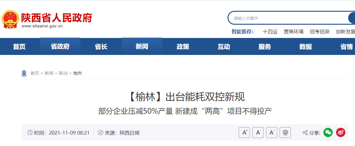 【榆林】出台能耗双控新规 部分企业压减50%产量 新建成“两高”项目不得投产