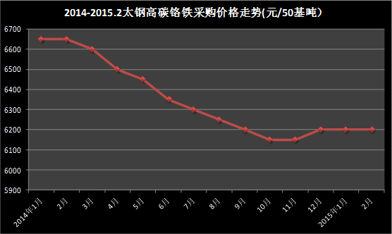 中国铁合金网讯:国内主要钢厂新一轮高碳铬铁采购价与上一轮持平,太钢采购价为6200元/50基吨(现款含税到厂价)、宝钢采购价为6450元/50基吨(现款含税到厂价)、酒钢采购价为6450元/50基吨(承兑含税到厂价),青山继续维持原定2015年第一季度采购价6500元/50基吨,与以往不同的... |