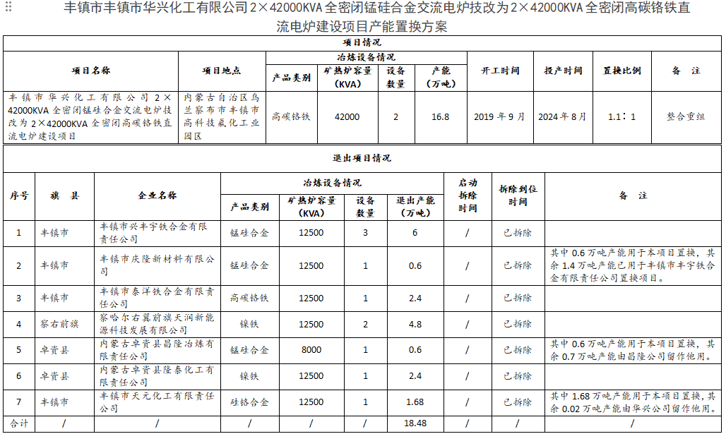 关于丰镇市华兴化工有限公司2×42000KVA全密闭锰硅合金交流电炉技改为2×42000KVA全密闭高碳铬铁直流电炉建设项目产能置换方案的公示