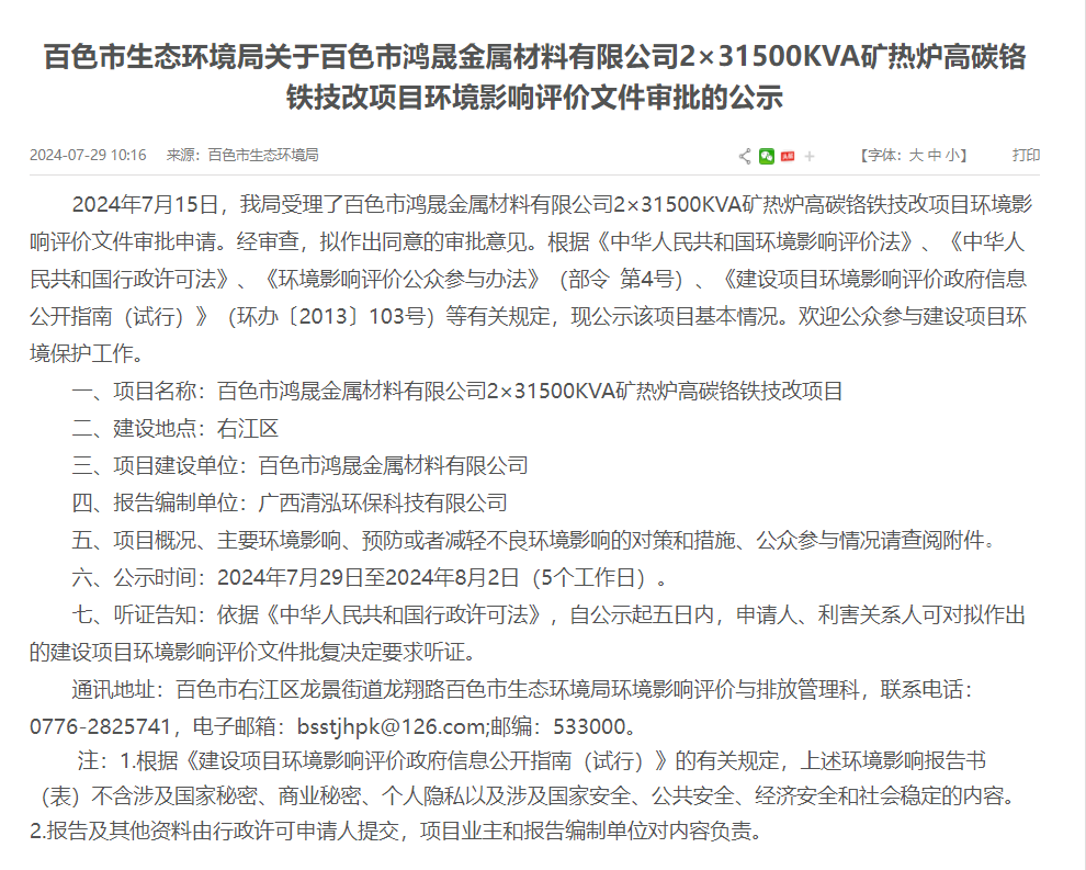 广西百色市鸿晟金属材料有限公司2×31500KVA矿热炉高碳铬铁技改项目环评获受理