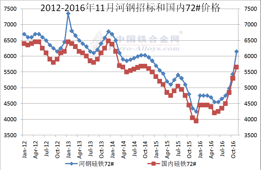 中国铁合金网讯:11月份各大钢企对硅铁采购价格持续上涨为主均价涨幅500元/吨,目前河北钢铁还未放出价格与数量,引发各行业网站猜测。 |