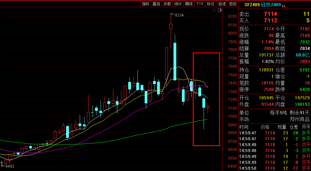 6月13日硅铁期货盘面下跌2.69% 收盘7102