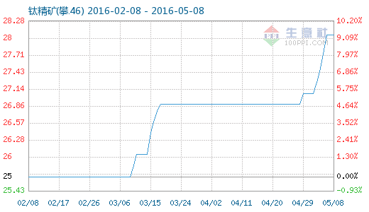 中国铁合金网讯:5月9日钛精矿(攀.46)商品指数为28.35,较昨日上升了0.3点,较周期内最高点100.00点(2012-10-30)下降了71.65%,较2015年04月16日最低点24.02点上涨了18.03%。(注:周期指2012-09-01至今) |