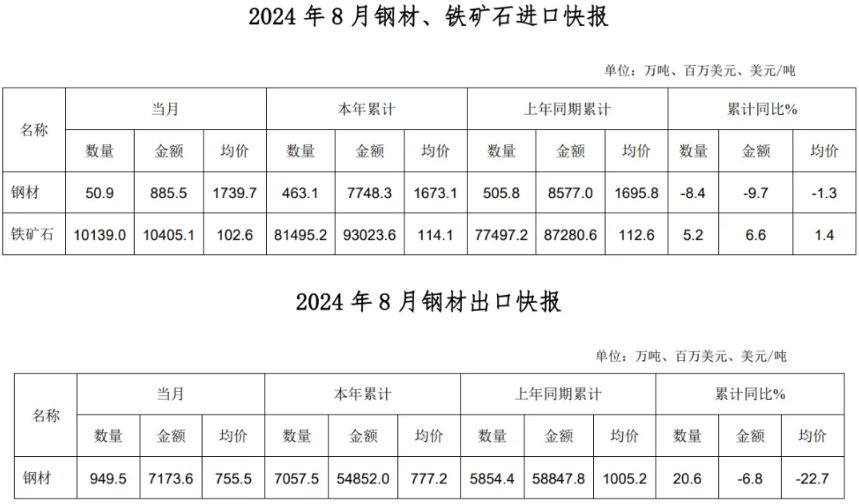 2024年8月,我国进口钢材50.9万吨,环比增加0.4万吨,增幅0.8%;均价1739.7美元/吨,环比下跌24.3美元/吨,跌幅1.4%。 |