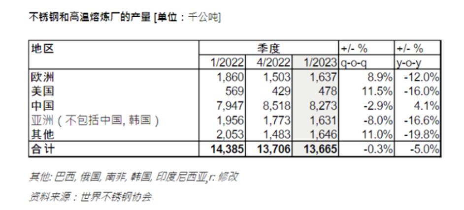 2023年7月10日,世界不锈钢协会发布了2023年前三个月的全球不锈钢产量数据,显示不锈钢粗钢产量达到1366万吨,同比下降5.0%。 |